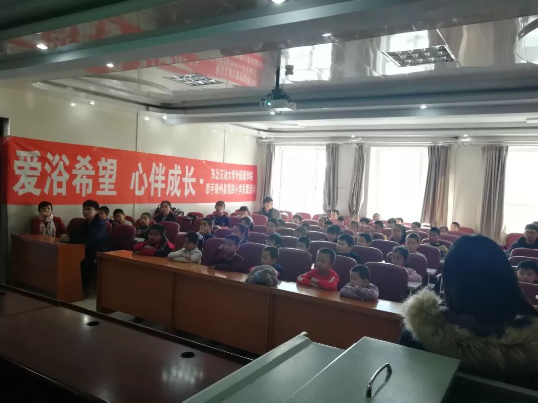 通过了解,留守儿童家中大多都是爷爷奶奶,我们便和于主席建立联系,并打算进一步获取孩子们各个班主任的微信,建立朋友圈。顺利沟通后,老师将孩子们领到我们的活动室,准备进行活动。首先,第四小学的周校长向各位老师孩子们介绍我们的身份和此次前来的目的,孩子们也向我们表示了感谢。张老师和外国语学院的优秀学生进行了自我介绍和关于此次活动的讲话。在这春寒料峭的季节,积雪未融,室外依旧是冰天雪地,室内却是其乐融融,无比温馨。接着活动就在温暖的气氛中开始了。首先外国语学院的志愿者们通过讲解PPT的方式和孩子们分享《小王子》的故事。在讲解的过程中,不时的向孩子们进行提问并邀请孩子们参与朗读,孩子们认真听讲,并对此表现积极,主动举手回答问题,参加朗读。最后,由志愿者领读PPT最后的一些经典的英文版语录。通过这样的方式,让孩子们有知识上的收获。分享故事后,由两个院的青协负责人带领孩子们解读两个院活动的横幅内容,并向孩子们表达了美好的祝愿。