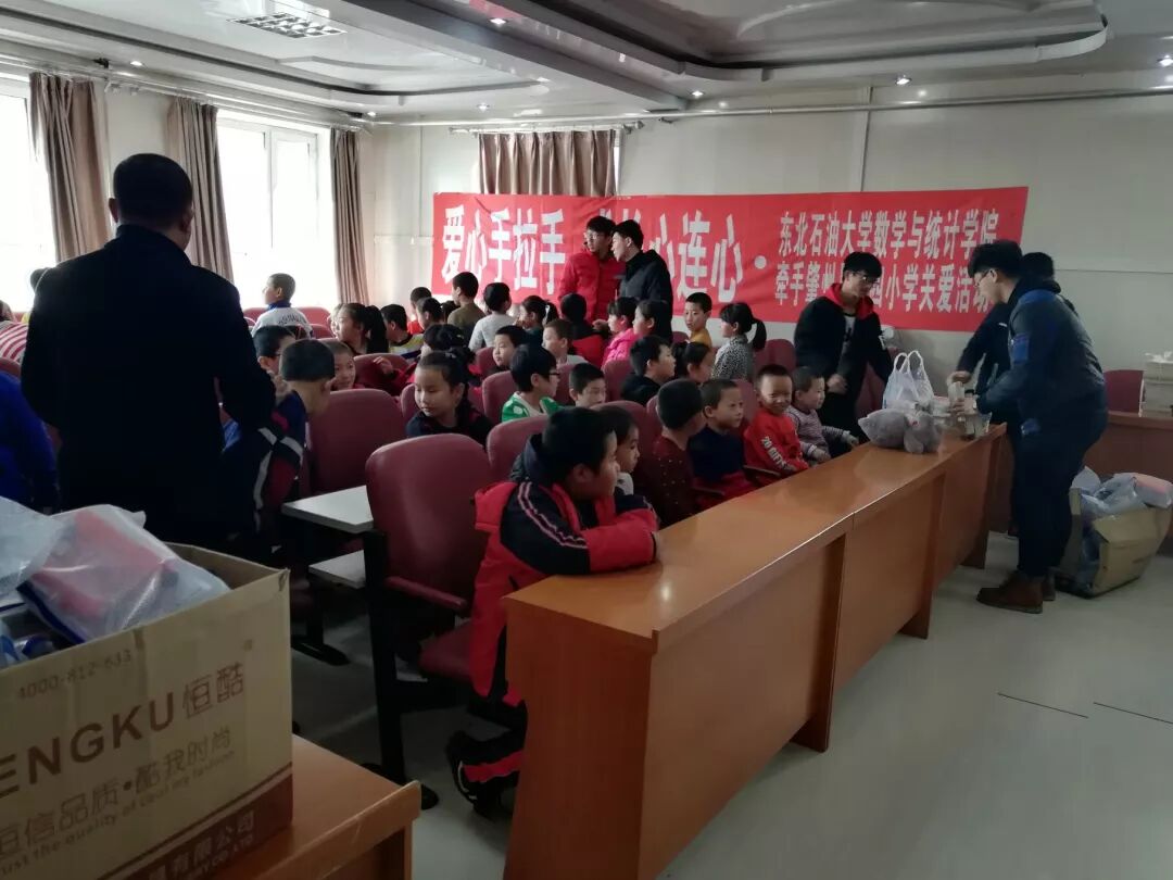 2018年3月14日上午七点十分,在北方依然寒冷的清晨中,外国语学院青协志愿者和院团委书记张丽坤、数学与统计学院志愿者和院大学生党支部书记沈老师共计18人,于二号门集合,乘坐面包车去往肇州县第四小学,踏上了一段颇有意义的旅程。经两个多小时的路途颠簸,老师和志愿者们于上午九点二十左右到达第四小学。通过与小学校长周兴吉联系后,由小学工会于主席热情接待进入校园。