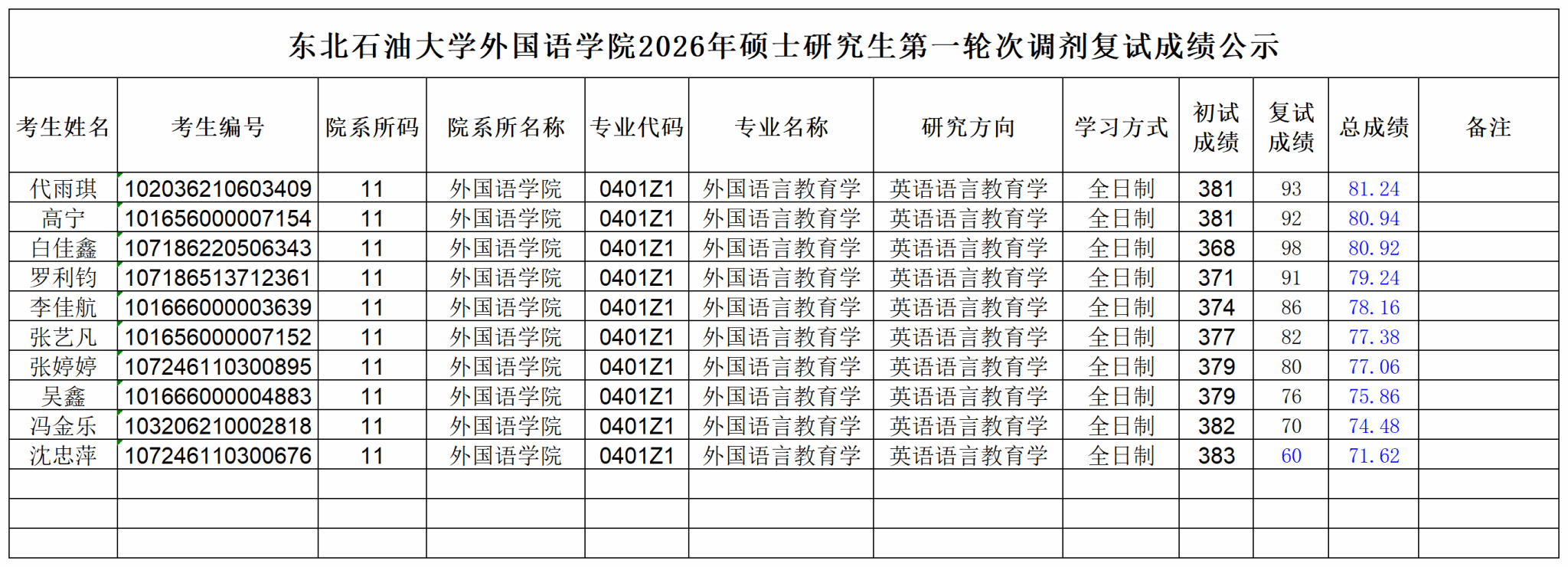 东北石油大学外国语学院2026年硕士研究生第一轮次调剂复试成绩公示