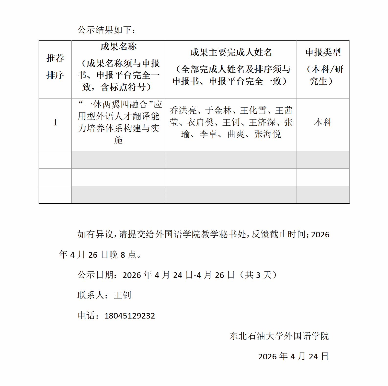 东北石油大学外国语学院拟推荐 石油高等教育教学成果奖(本科)信息公示
